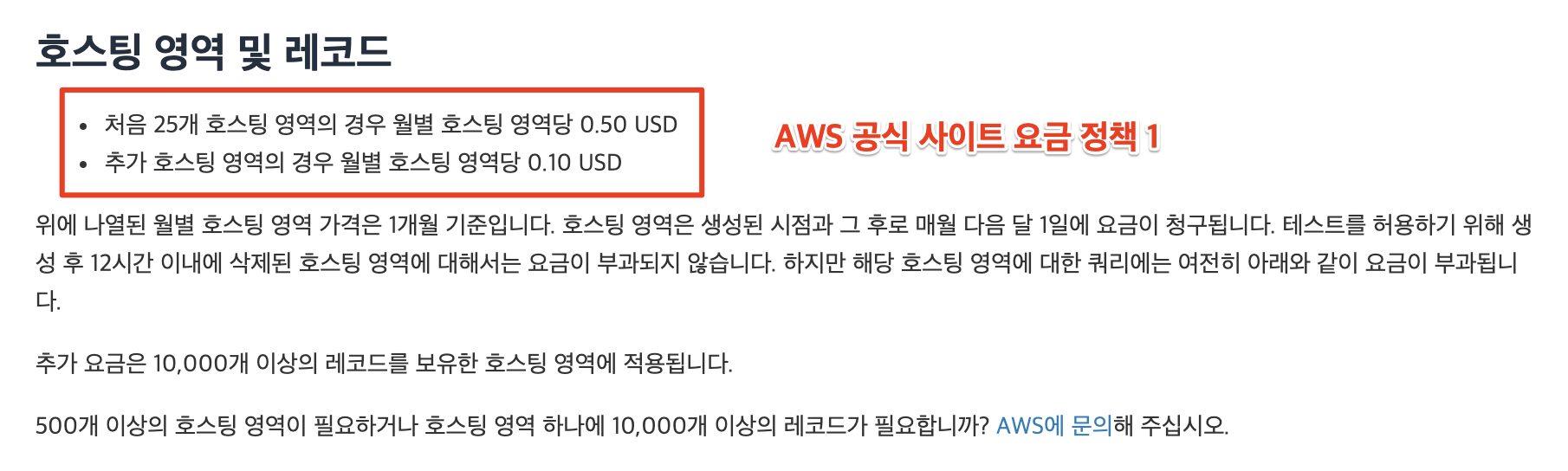 | 호스팅 영역 관리 | 호스팅 영역에 대한 월별 요금 지불(25개까지 영역당 $ 0.5. 추가부터 영역당 $0.1) |