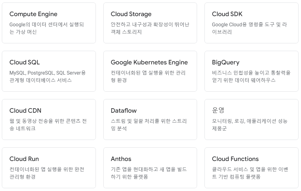 구글에서는 다음과 같은 카테고리로 제품군을 나눴습니다. AI 및 머신러닝, AI 빌딩 블록, API 관리, Compute, 컨테이너, 데이터 분석, 데이터베이스, 개발자 도구, 의료 및 생명과학, 하이브리드 및 멀티 클라우드, 사물 인터넷(IoT), 관리 도구, 미디어 및 게임, 마이그레이션, 네트워킹, 운영, 보안 및 ID, 서버리스 컴퓨팅, 스토리지, 기타 Google Cloud 제품