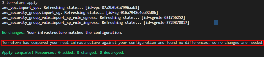 import 하는 모든 리소스를 no change가 출력되도록 값을 맞춰줘야합니다.