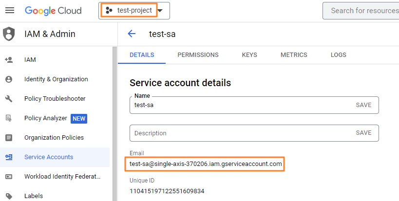 프로젝트 생성이 완료되면 아래와 같이 Service Account(test-sa)를 만듭니다.