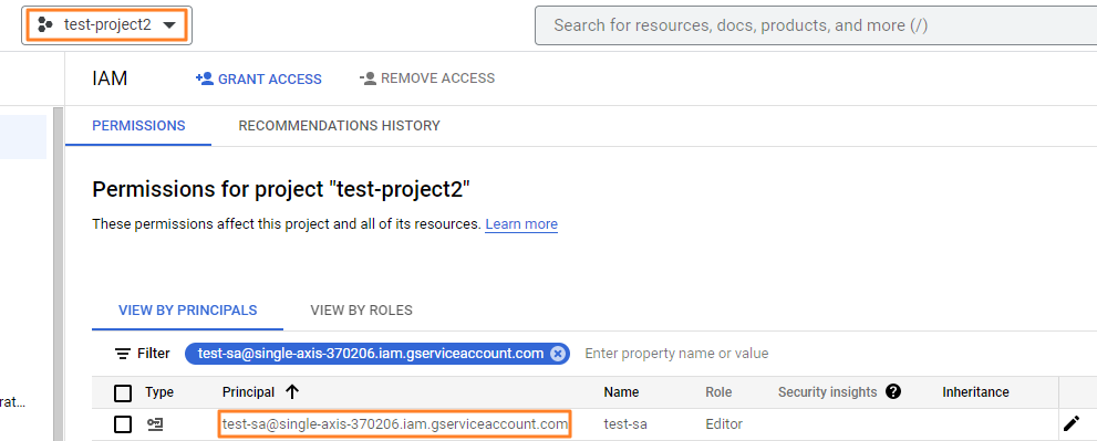 이후 프로젝트 B(test-project2)를 생성한 후 test-sa account에 Editor 권한을 부여합니다.