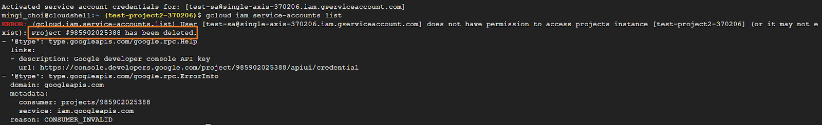 Project A(test-sa) number가 삭제됐다는 error message와 함께 실행이 불가한 것을 확인할 수 있습니다.