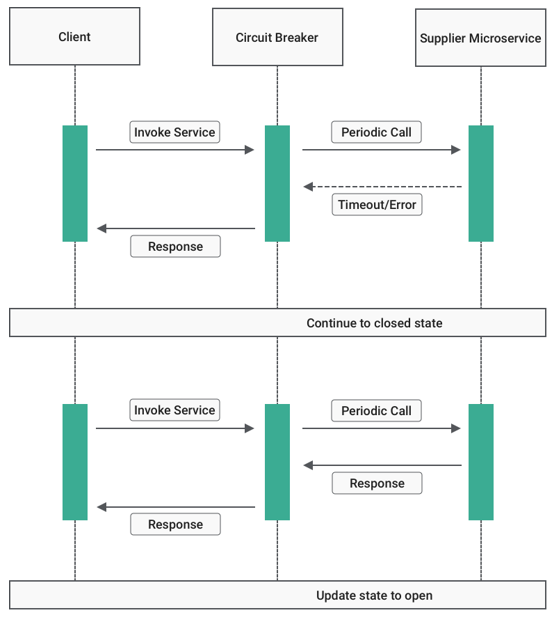 이 상태에서 circuit breaker는 요청을 마이크로 서비스로 라우팅하고 각 기간의 실패 횟수를 계산합니다.