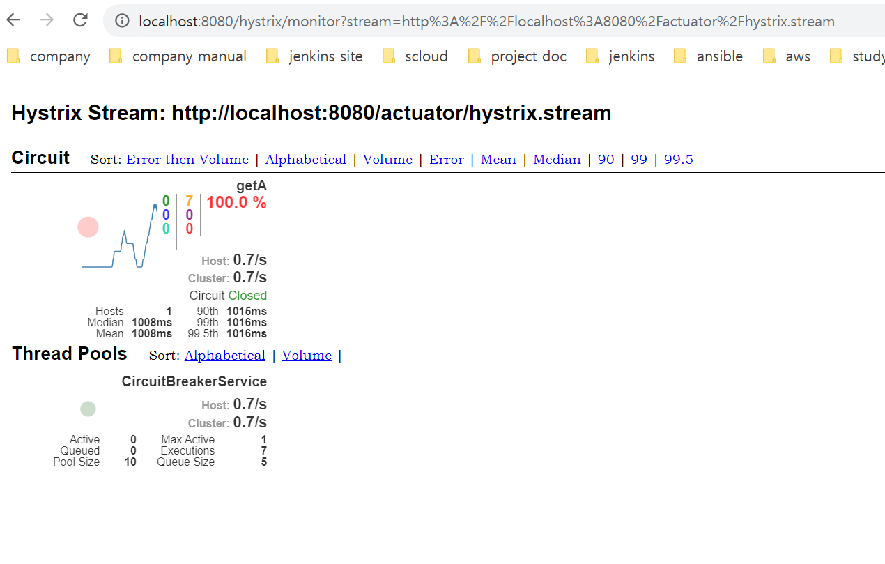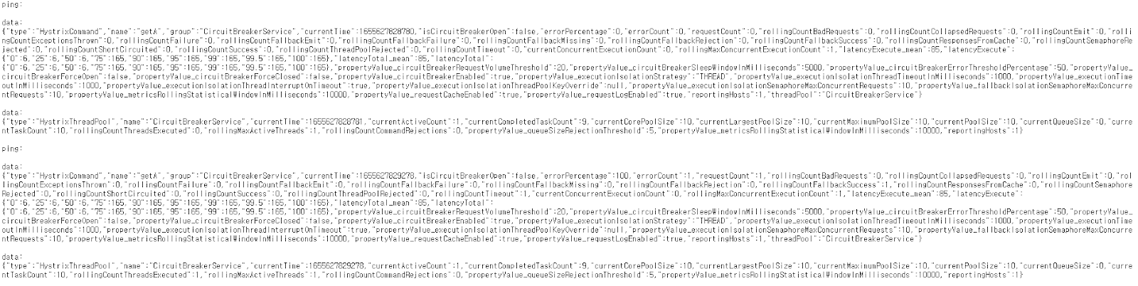 /actuator/hystrix.stream 통하여 메서드의 상태 현황 정보를 체크합니다.