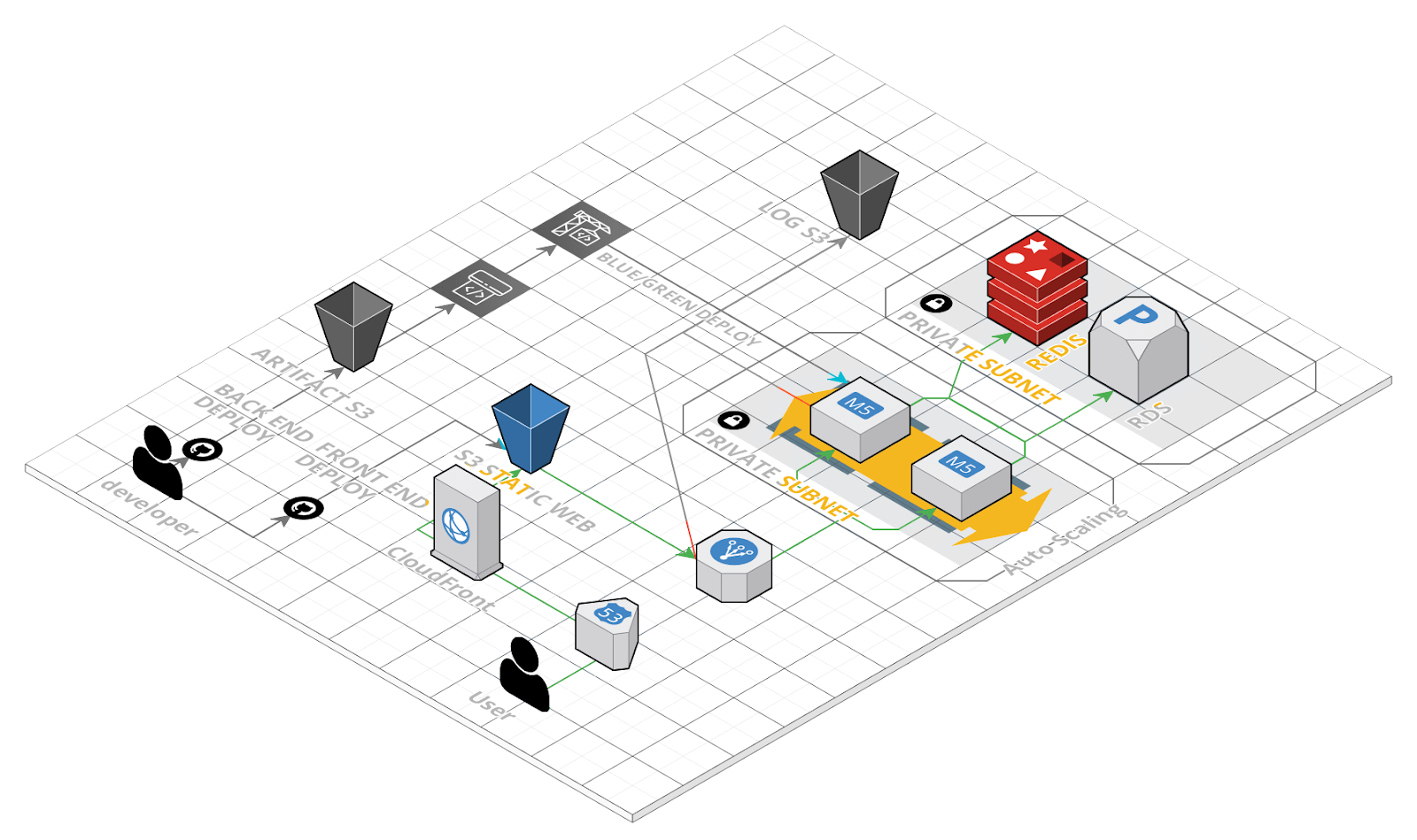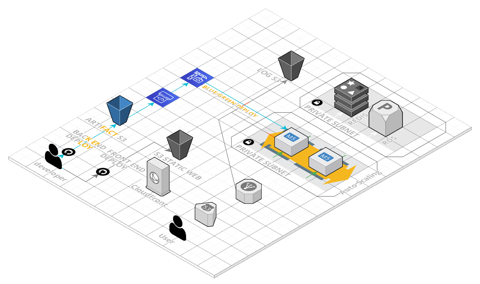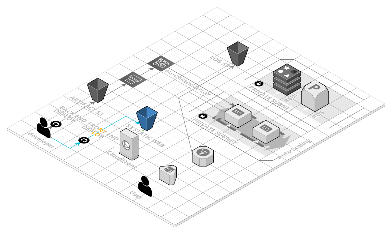 기본 템플릿의 서비스플로우는 위 그림과 같습니다. 사용자의 url 요청은 Route53을 타고 들어와 CDN 서비스인 CloudFront를 거쳐 WEB용 코드를 호스팅하는 S3로 전달됩니다. 이 요청은 ALB를 타고 부하분산을 거쳐 오토스케일링 그룹에 묶여 있는 WAS 서버로 전달되며, 그 뒤에 DB로 전달됩니다.