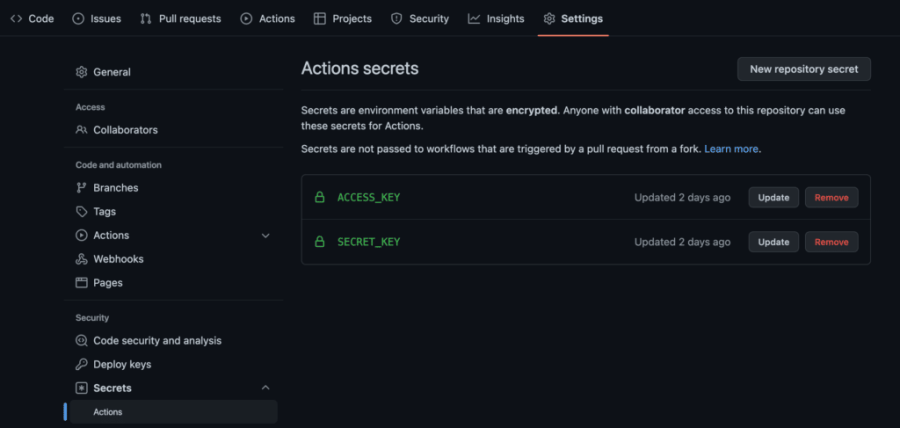 우선 workflow.yaml에서 사용 할 수 있도록, aws에 접근 가능한 AWS-ACCESS-KEY와 SECRET-KEY를 Github에 설정해야 합니다.