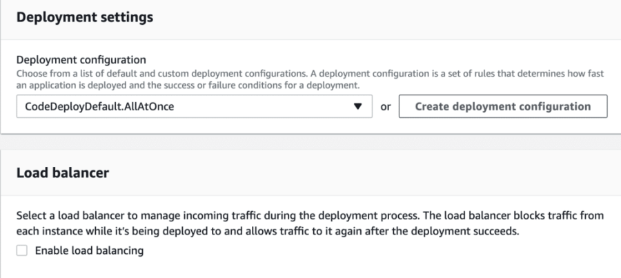 Deployment configuration은 지금은 CodeDeployDefault.AllAtOnce를 선택하고 Load balancer도 설정하지 않을 것이므로 체크를 해제하고 Deployment group을 생성 해줍니다.