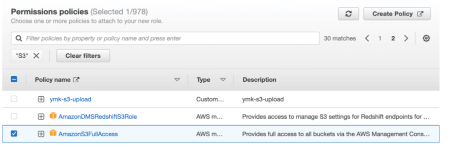 Use case의 EC2를 선택하고 다음을 진행하여 policy를 선택해 줍니다.