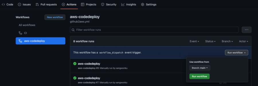 여기서 한 가지 주의 할 점이 aws codedeploy 부분은 실행을 하면 오류가 났는지 판다하는 로직을 작성하지 않아 정말 실행만 됩니다. 실 운영 환경에서는 당연히 체크 하는 부분을 입력해야 할 것입니다.