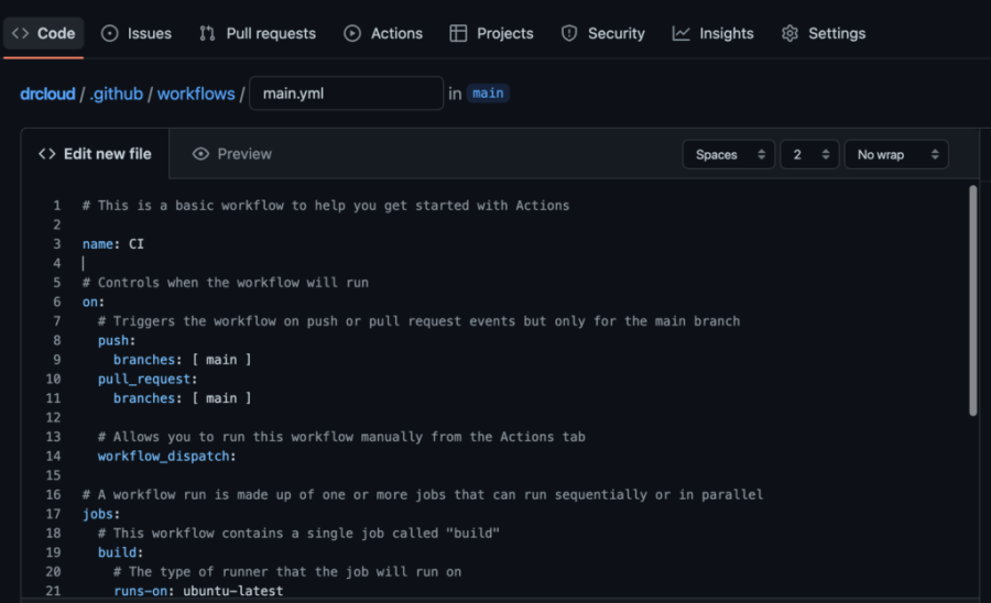 이제 main.yml 이라는 기본 이름과 함께 workflow를 설정할 수 있는 edit 창이 열리며 여기서 이제 직접 수정하여 ec2 인스턴스에 배포해보도록 하겠습니다.