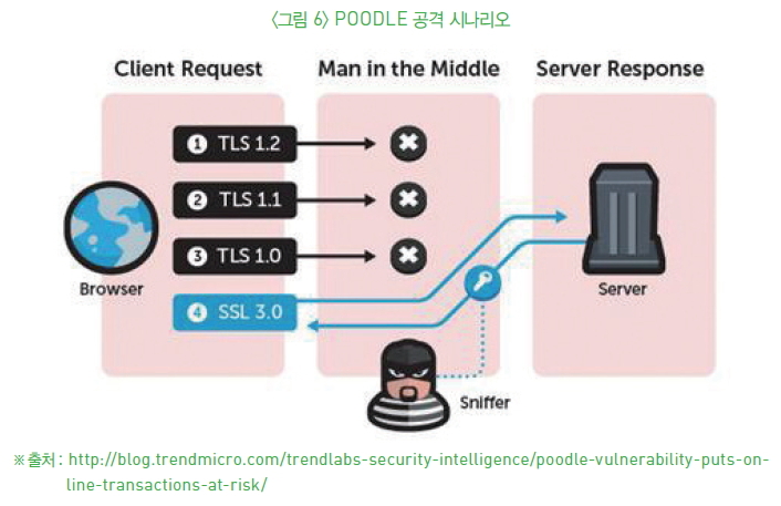 - TLS를 사용하고 있다고 해도 SSL 3.0으로 다운그레이드 당하여 POODLE 공격을 받을 취약점이 있다.