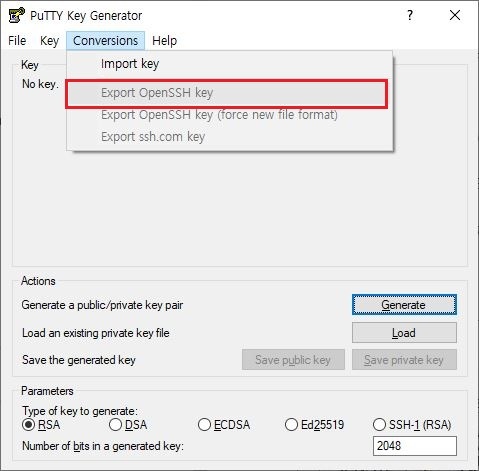 PRIVATE 키를 추출하기 위해서는 위 사진에 보이는 빨간색 상자안의 버튼을 눌러 [FILE NAME].ppk 파일을 저장하여 putty로 접속시 사용할 수있습니다.