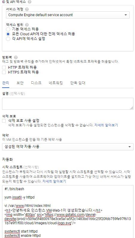 - 액세스 범위 : 인스턴스에서 접근 가능한 범위를 설정합니다. GCP에 존재하는 API에 대한 범위입니다.