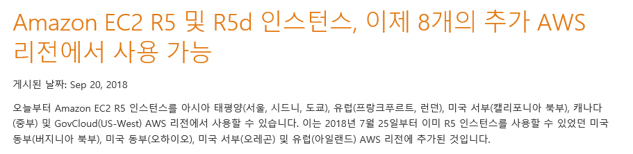 지난해 2018년 3월 이후 Amazon EC2 5세대 인스턴스가 서울리전에 출시되었습니다. 정확한 출시일은 M5 인스턴스는 2018년3월13일, C5 인스턴스는 2018년 4월10일, R5 인스턴스는 2018년9월20일 입니다. 벌써