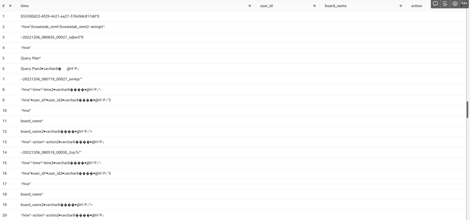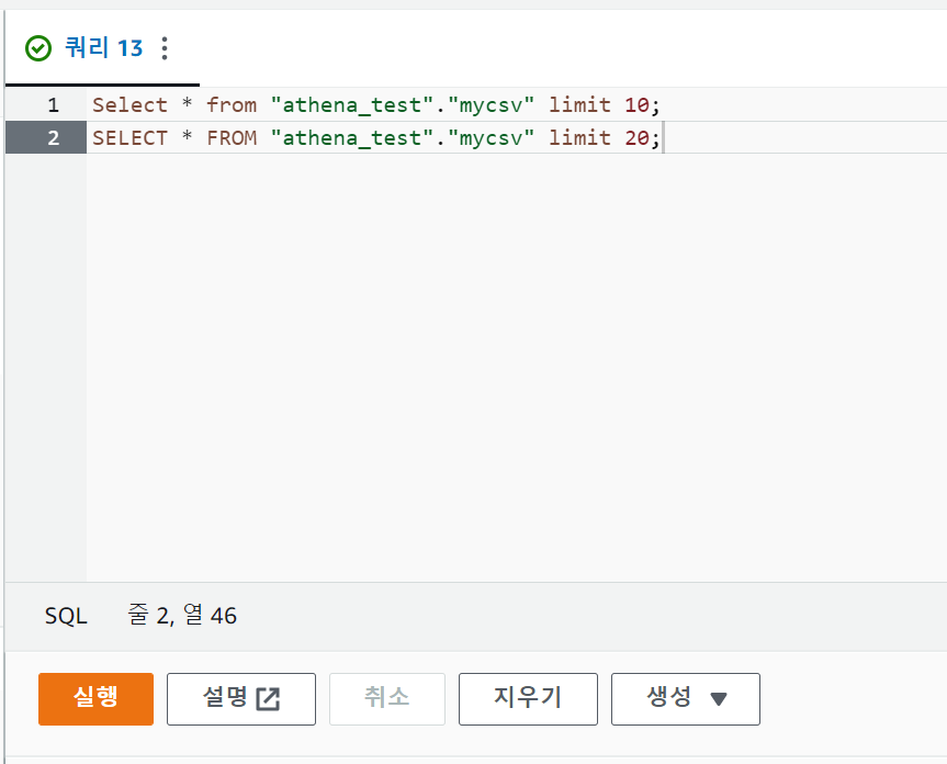 SELECT * FROM "athena_test"."mycsv" limit 20; 구문 실행 결과가 좀 이상하다는걸 확인할수 있었는데요