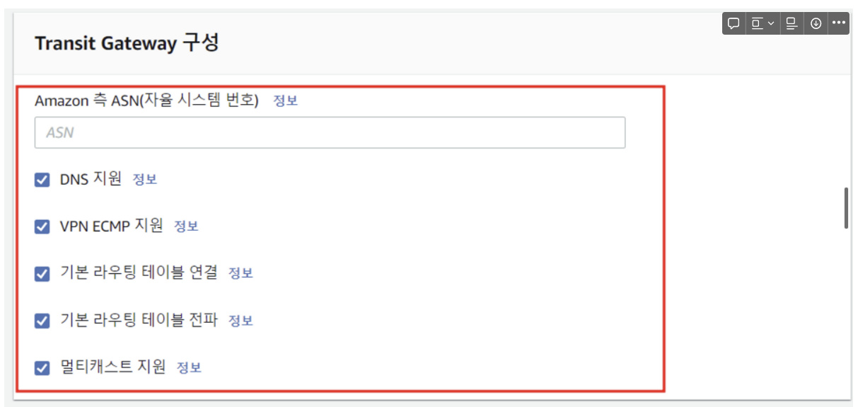 - Transit Gateway private ASN 부여 이 번호는 경계 게이트웨이 프로토콜 [ BGP ] 세션의 Aws 측에 대한 ASN 이여야 함.