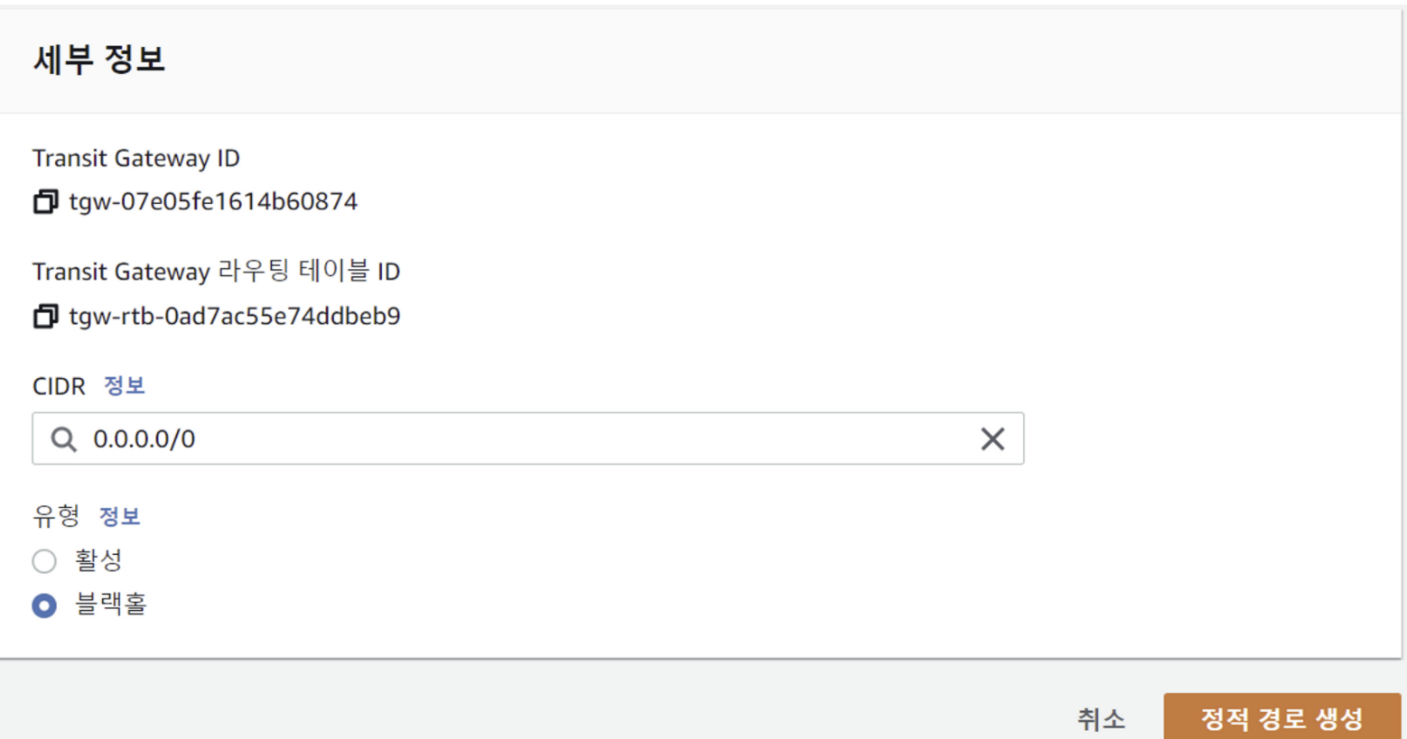- VPC,VPN 또는 Transit Gateway 피어링 연결에 대한 정적 경로를 생성하거나 해당 경로와 일치하는 트래픽을 삭제하는 블랙홀 경로를 생성