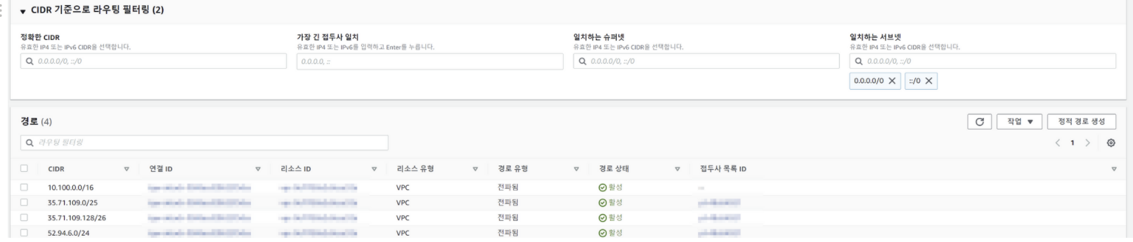 - VPN 연결을 대상으로 하는 Transit Gateway 라우팅 테이블의 정적 경로는 Site-to-Site VPN을 기준으로는 필터링이 되지 않음