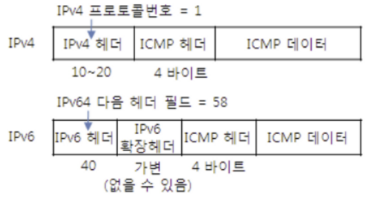 - ICMP IPv6: 목적지 도달불가(1), 패킷길이초과(2), 시간초과(3), 매개변수 문제(4)
