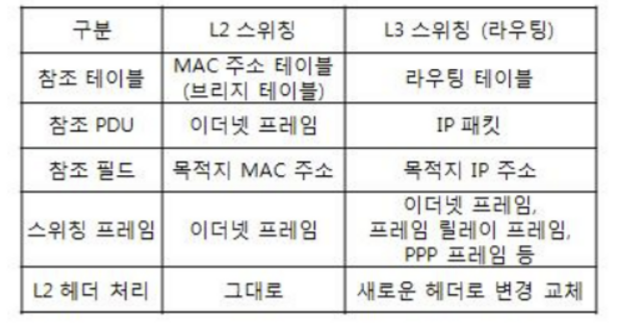 - L2 스위칭 및 L3 스위칭 비교