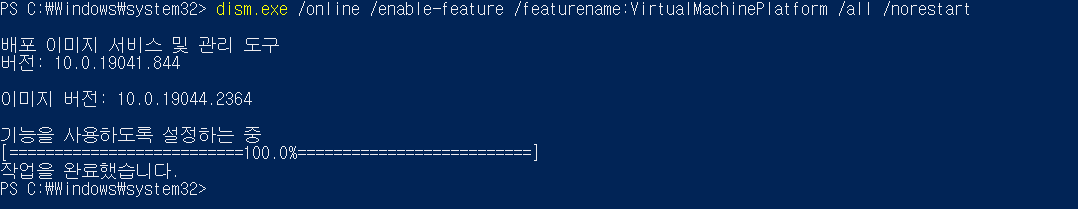 3) 아래 명령어를 입력 → (Virtual Manchin 플랫폼) 옵션을 사용 가능하게 만들기