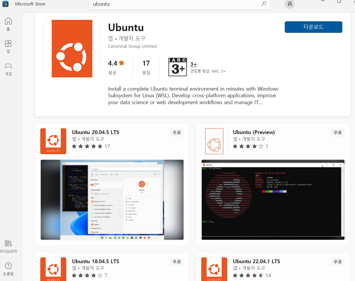 [윈도우] - [Microsoft Store] 에서 ubuntu 검색