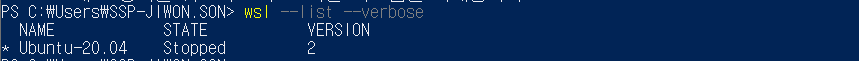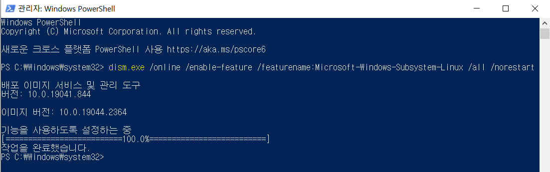 2) PowerShell 에서 아래 명령어를 실행 → ( Linux용 Windows 하위시스템 ) 옵션을 사용 가능하게 만들기