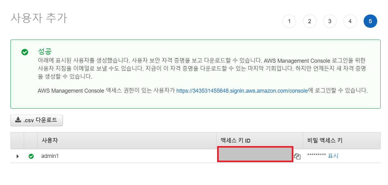 액세스키와 비밀 액세스키를 보관합니다.(.csv 다운로드)