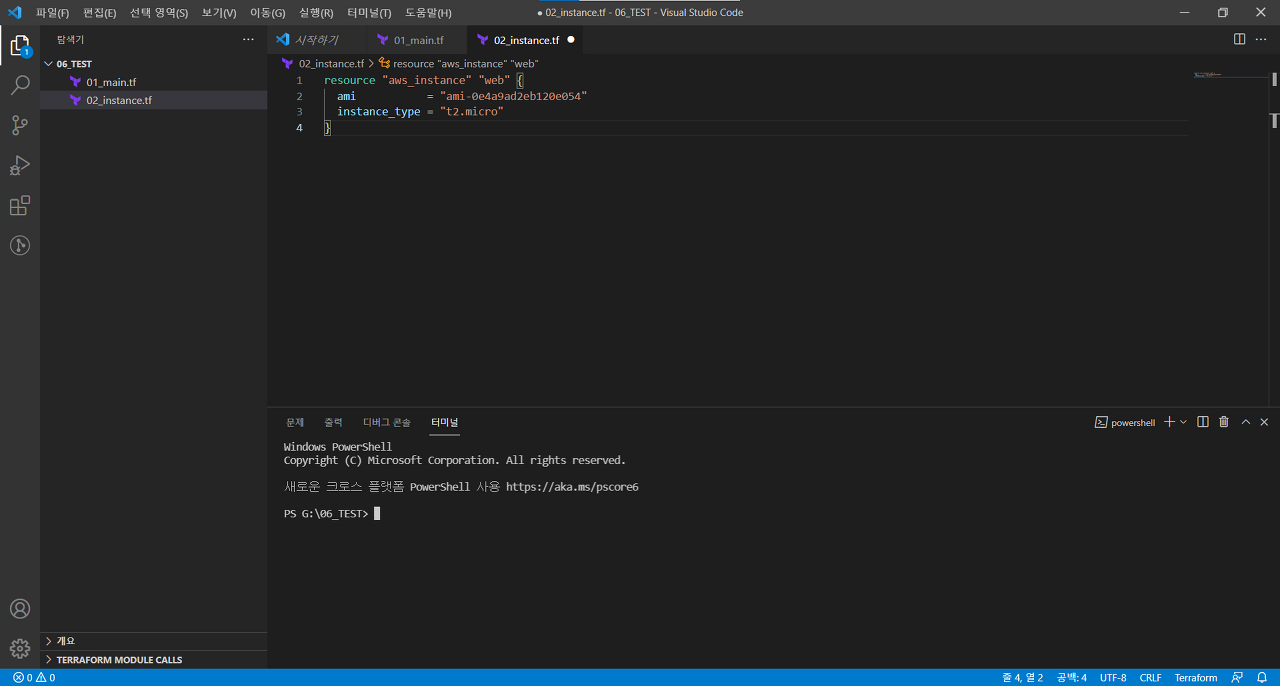 02_instance.tf 파일을 만들고 다음과 같이 내용을 넣어줍니다.