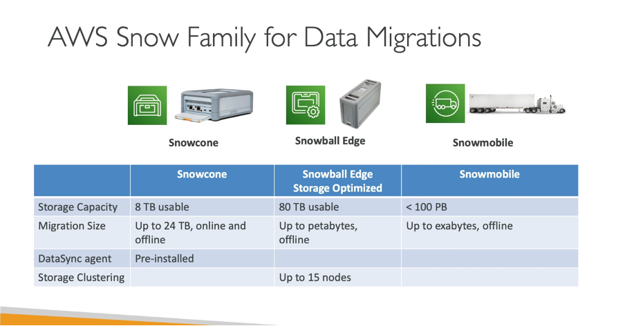 AWS Snow 패밀리는 네트워크에 대한 의존 없이 대량 데이터를 클라우드 안팎으로 마이그레이션할 수 있도록 지원하는 물리적 디바이스의 모음으로서, 이를 통해 분석, 파일 시스템 및 아카이브에 대한 다양한 AWS 서비스를 데이터에 적용할 수 있습니다. AWS Snowcone은 AWS Snow 패밀리 엣지 컴퓨팅 및 데이터 전송 디바이스 중 가장 작은 제품입니다. Snowcone은 견고하고 안전한 휴대용 제품입니다. Snowcone을 사용하면 데이터를 수집, 처리하고 디바이스 배송을 통해 오프라인으로, 또는 AWS DataSync를 통해 온라인으로 AWS로 이동할 수 있습니다. AWS Snowball은 여행 가방 크기의 데이터 마이그레이션 및 엣지 컴퓨팅 디바이스로, Compute Optimized와 Storage Optimized의 두 가지 디바이스 옵션으로 제공됩니다. Snowball Edge Storage Optimized 디바이스는 vCPU 40개의 컴퓨팅 용량과 함께 80테라바이트의 사용 가능한 블록 또는 Amazon S3와 호환되는 객체 스토리지를 제공합니다. 이 옵션은 로컬 스토리지 및 대규모 데이터 전송에 적합합니다. Snowball Edge Compute Optimized 디바이스는 vCPU 52개, 42테라바이트의 사용 가능한 블록 또는 객체 스토리지, 그리고 연결되지 않은 환경에서 수행하는 고급 기계 학습 및 풀 모션 비디오 분석 등의 사용 사례에 적합한 GPU(선택 사항)를 제공합니다. AWS Snowmobile은 견인 트레일러로 옮길 수 있는 선적 컨테이너입니다. 이러한 서비스는 데이터 마이그레이션, 재해 복구, 데이터 센터 종료 및 원격 데이터 수집 프로젝트를 지원할 수 있습니다.
