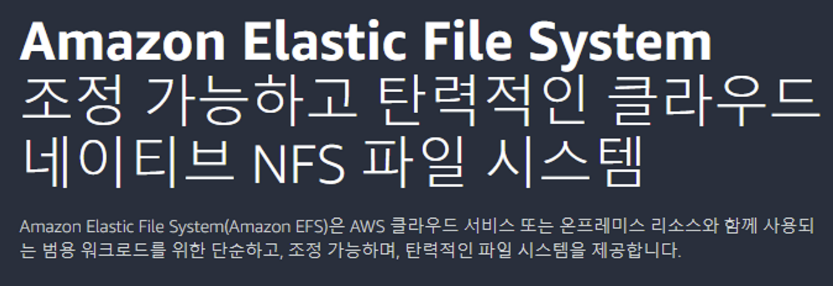 - 스토리지 용량과 성능을 프로비저닝하거나 관리하지 않고도 파일 데이터를 공유할 수 있도록 완전히 탄력적인 서버리스 파일 스토리지를 제공