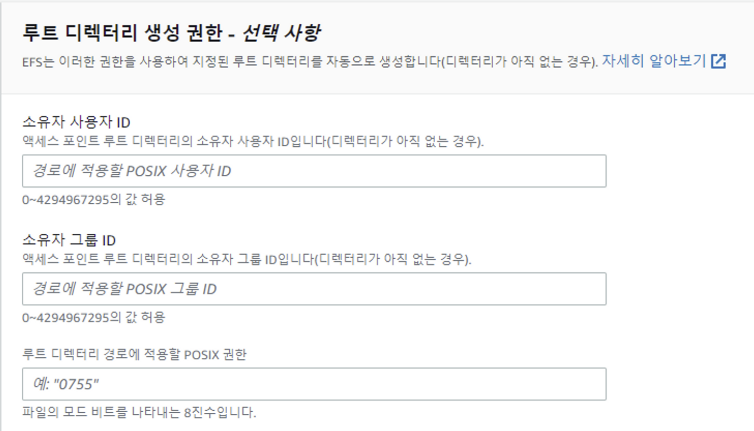 루트 디렉터리 생성 권한 → EFS는 이러한 권한을 사용하여 지정된 루트 디렉터리를 자동으로 생성