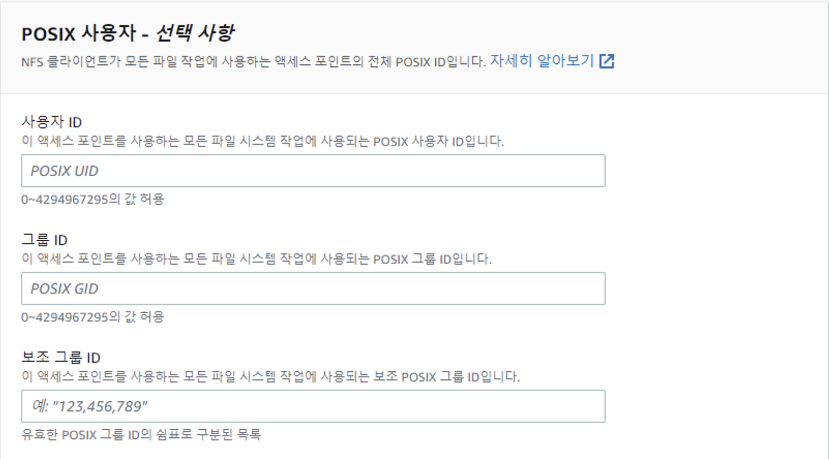 - 보조 그룹 ID → 액세스 포인트를 사용하는 모든 파일 시스템 작업에 사용되는 보조 POSIX 그룹 ID