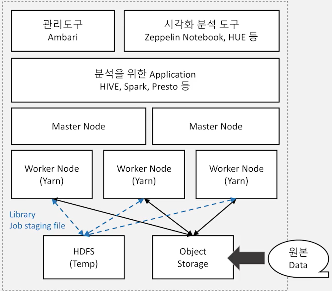- 다양한 유형의 스토리지 제공- 기본 저장소(HDFS)로 Block Storage를 지원- Object Storage와도 연동이 가능