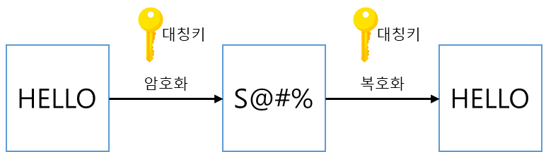 - 대칭키 : 암호화를 하거나 복호화를 할 때 같은 키를 사용함. DES, AES 같은 알고리즘을 사용함