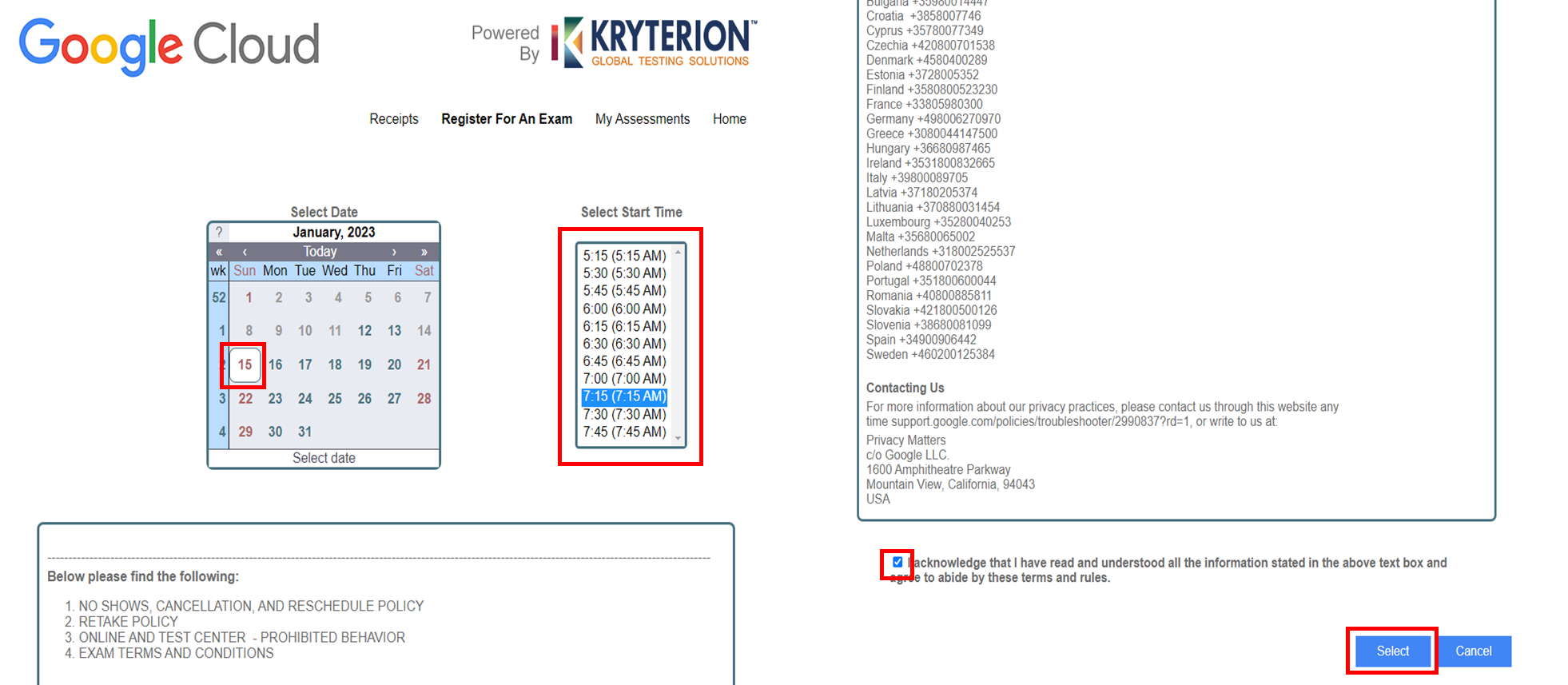 다음으로 시험 일정 선택 단계입니다. 활성화되어있는 날짜 중 원하는 날짜를 선택하시고, 가능한 시간대를 선택 후 스크롤을 내려서 동의버튼 체크후 'Select' 버튼을 눌러주시면 됩니다.