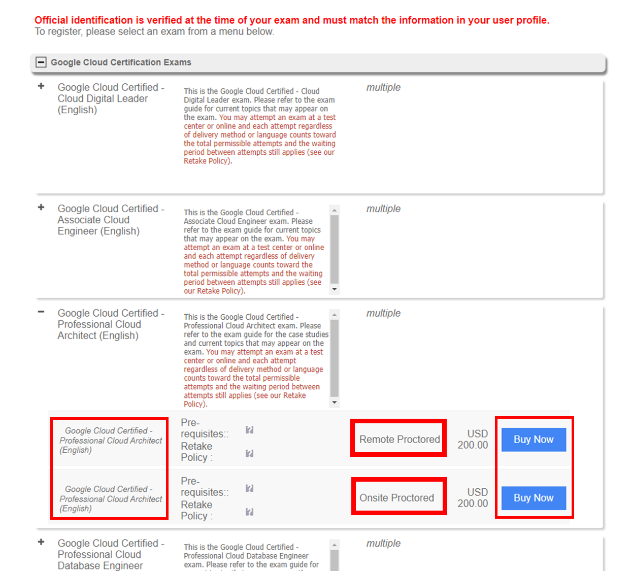 응시 할 자격증 종류를 선택한 후 원격(Remote) , 현장(Onsite) 여부를 선택해 'Buy Now' 버튼을 눌러주시면 됩니다.