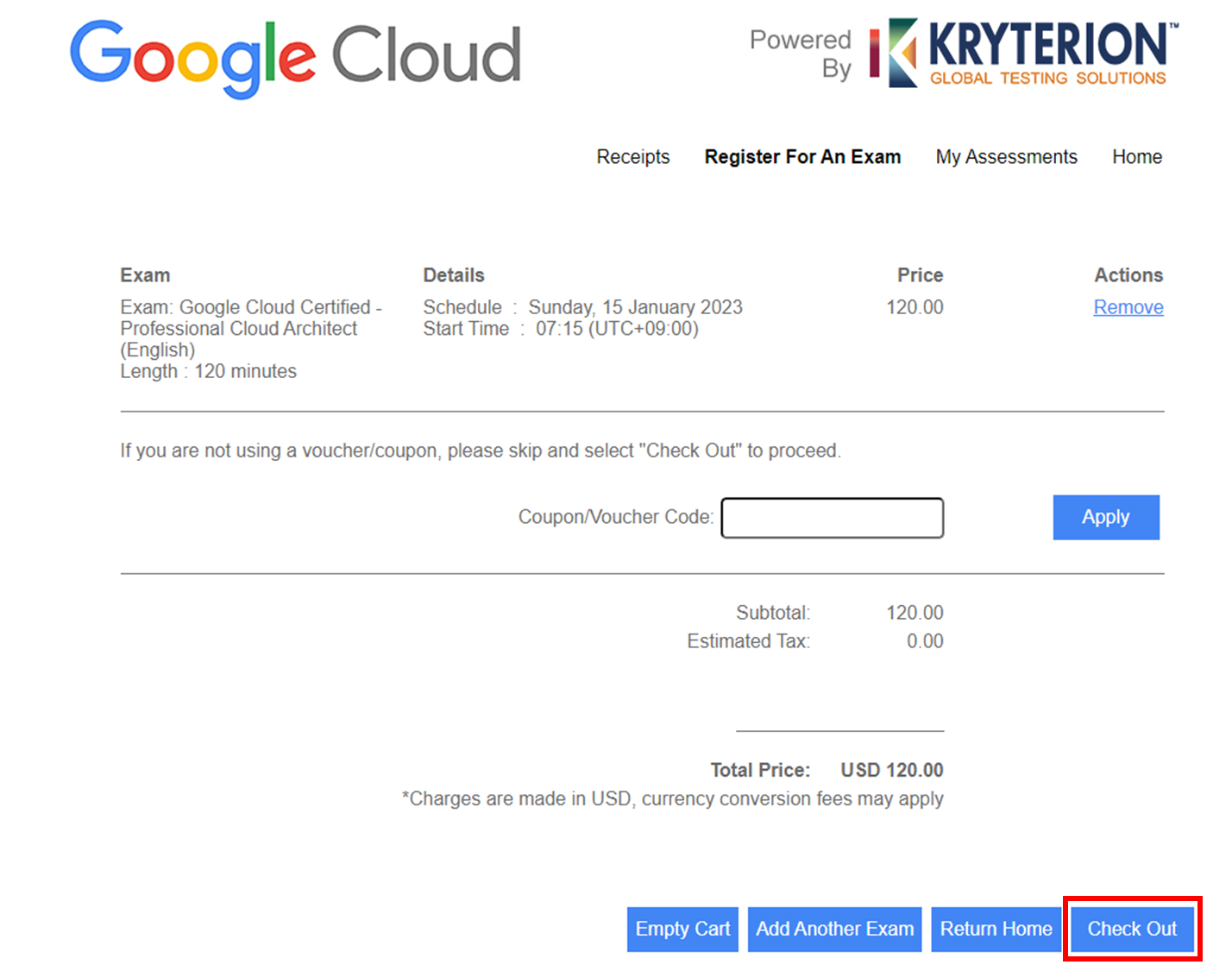 시험 등록 정보를 확인하신 후 Coupon이나 Voucher Code가 있으신 경우 입력해 주시고, 없는 경우 바로 'Check Out' 버튼 눌러주시면 됩니다.