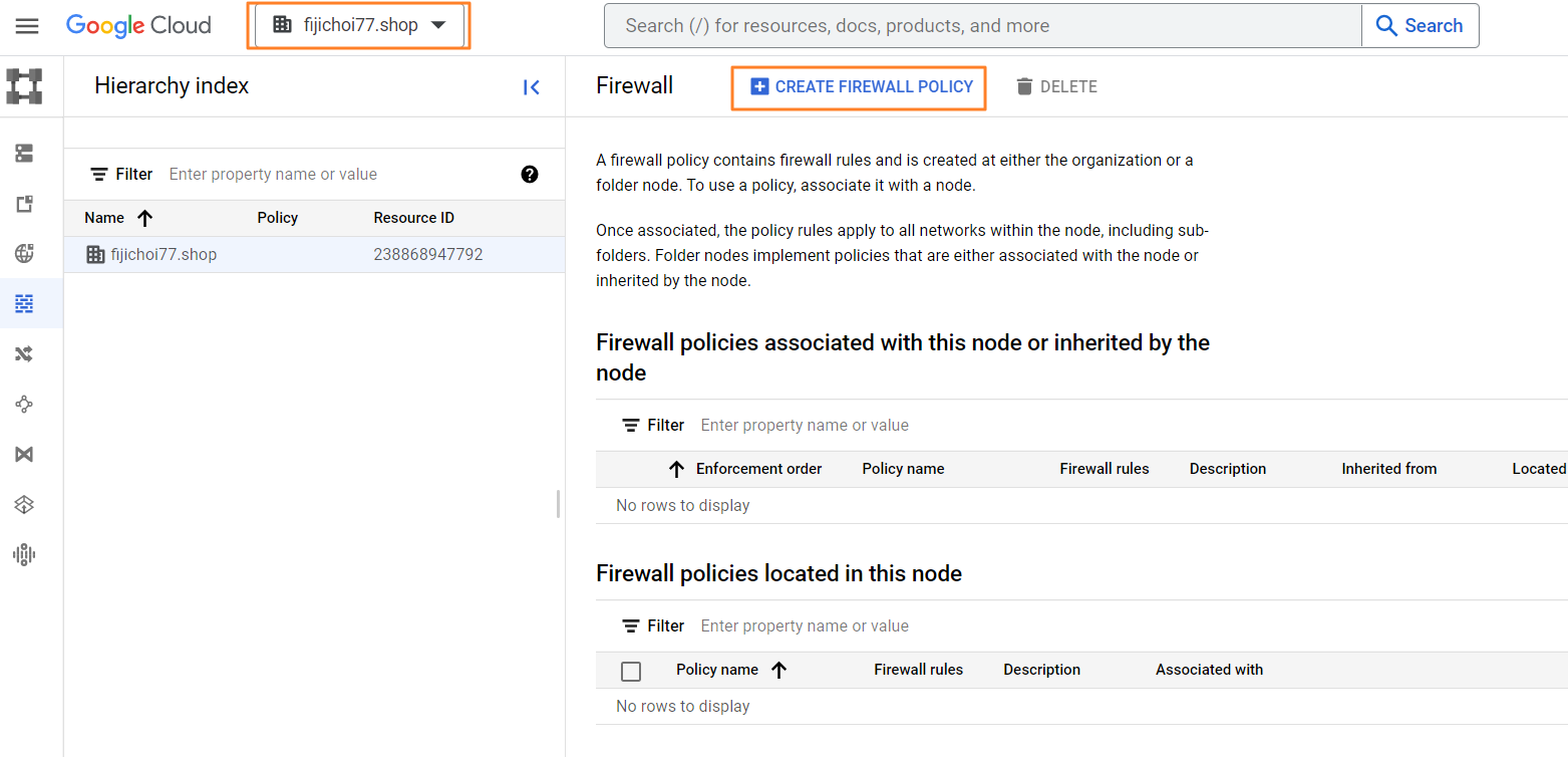 1) 계층식 방화벽 정책을 적용하고자 하는 조직으로 이동하여 VPC Network > Firewall > + Create Firewall Policy를 선택합니다.