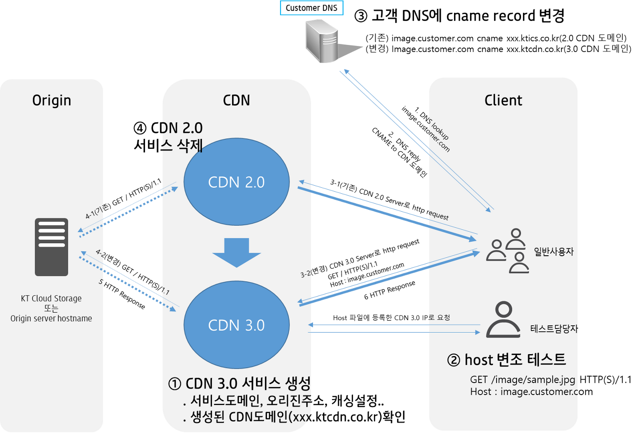 1) 고객 도메인이 등록된 DNS에서 cname record의 목적지를 기존 2.0 cdn도메인에서 3.0 cdn 도메인으로 변경합니다.