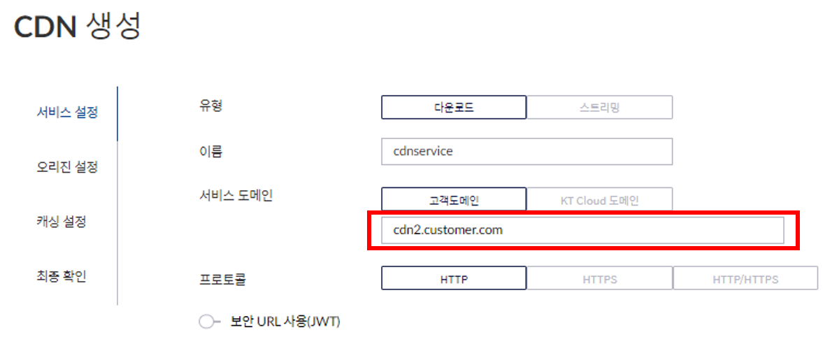 2) 고객도메인 : CDN 2.0 설정의 고객도메인을 동일하게 입력합니다.