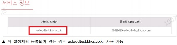- 위 그림처럼 서비스 도메인이 등록되어 있지 않은 경우에는 KT Cloud에서 제공하는 ‘글로벌 CDN 도메인’을 직접 사용하실 수 있습니다.