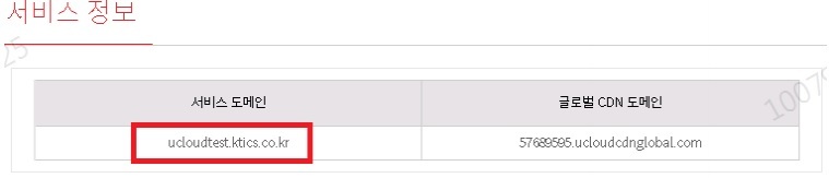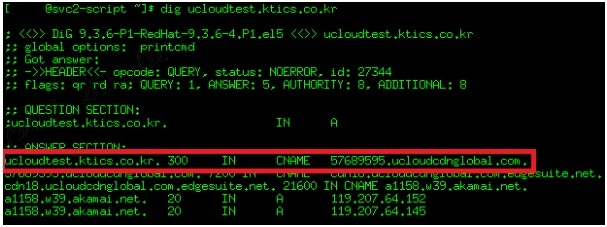 서비스 도메인 (ucloudtest.ktics.co.kr)을 CDN 도메인(57689595.ucloudcdnglobal.com) 으로 CNAME 설정 시,
