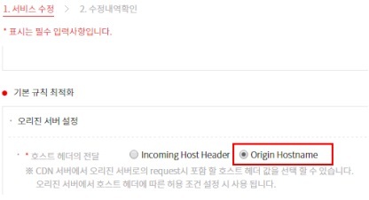 <Action -> 서비스 수정 -> 기본규칙 최적화 설정>에서 오리진 서버 설정의 호스트헤더의 전달 방식을 <Origin Hostname>으로 변경