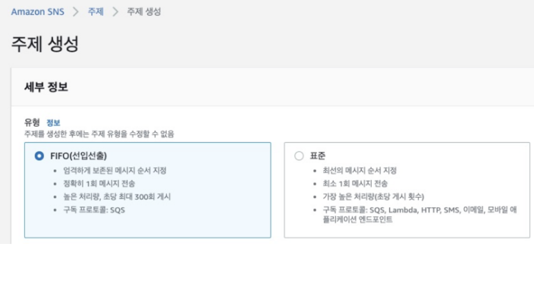 SQS는 대기열로 디커플링, SNS는 주제(Topic)를 생성하여 구독자를 대상으로 디커플링 서비스를 함을 잊지 맙시다. SNS도 표준 방식과 FIFO 방식이 있습니다.