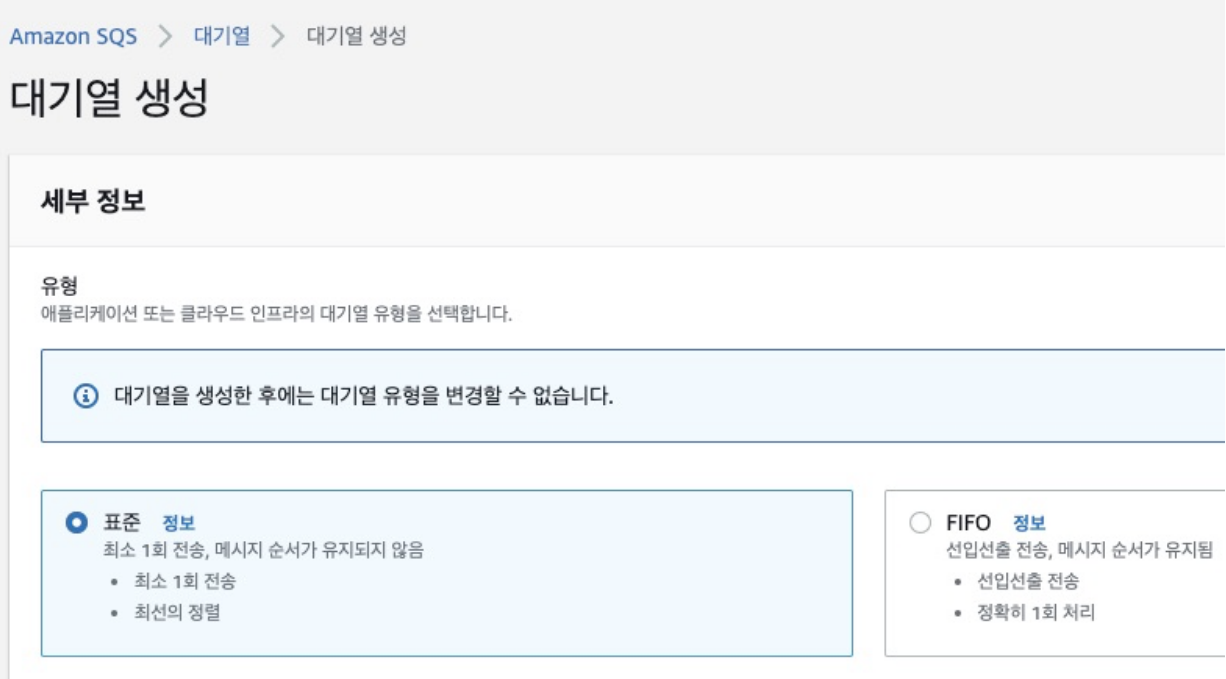 SQS의 대기열은 표준 방식(Standard)과 FIFO 방식 2가지가 있습니다.