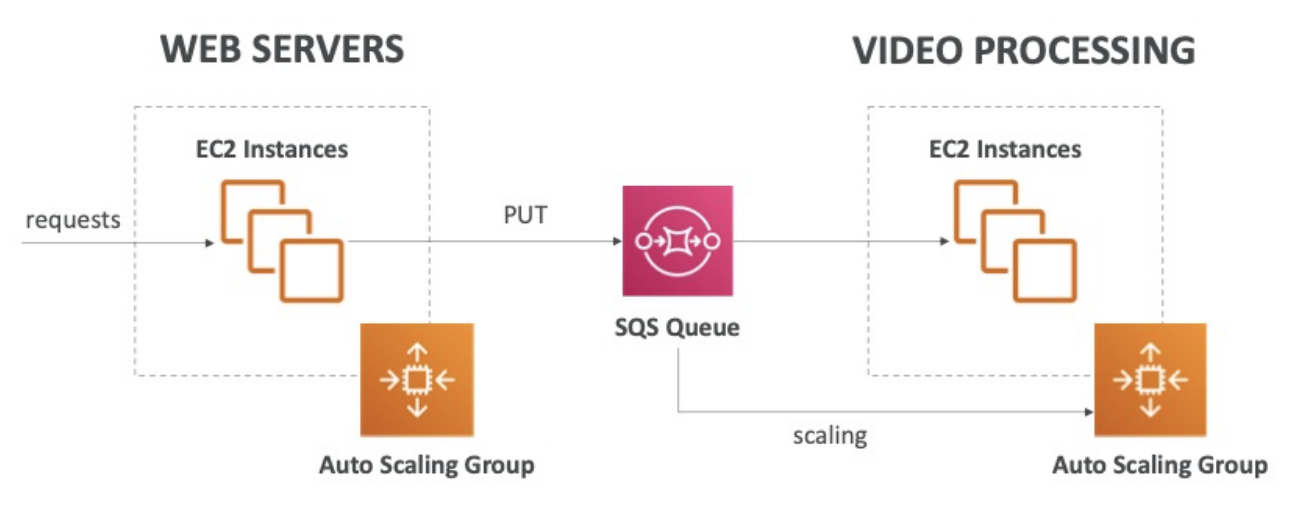 위 이미지에서 예를 들었듯, 사용자가 본인의 비디오 파일을 업로드하면, SQS는 이를 별도의 비디오 프로세싱 시스템으로 전달하여 후속 작업을 진행하도록 합니다.
