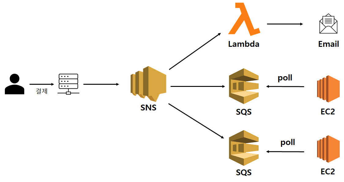 사용자가 웹사이트에서 물건을 구매했다고 가정하겠습니다. 이때 웹서비스가 갖는 결제 정보를 활용해서 서비스를 만든다고 가정해보면, 우리는 이 결제정보를 publish(발행)할 것입니다. 이때 우리는 SNS를 사용할 수 있습니다. 사용자가 웹사이트에서 물건을 구매했고 해당 결제 정보는 다음과 같습니다!! 를 알리며 결제 정보를 메시지에 담아 SNS Topic에 발행합니다. 우리는 이 메시지를 활용하여 각각 다른 서비스들을 만들어 볼 것입니다.