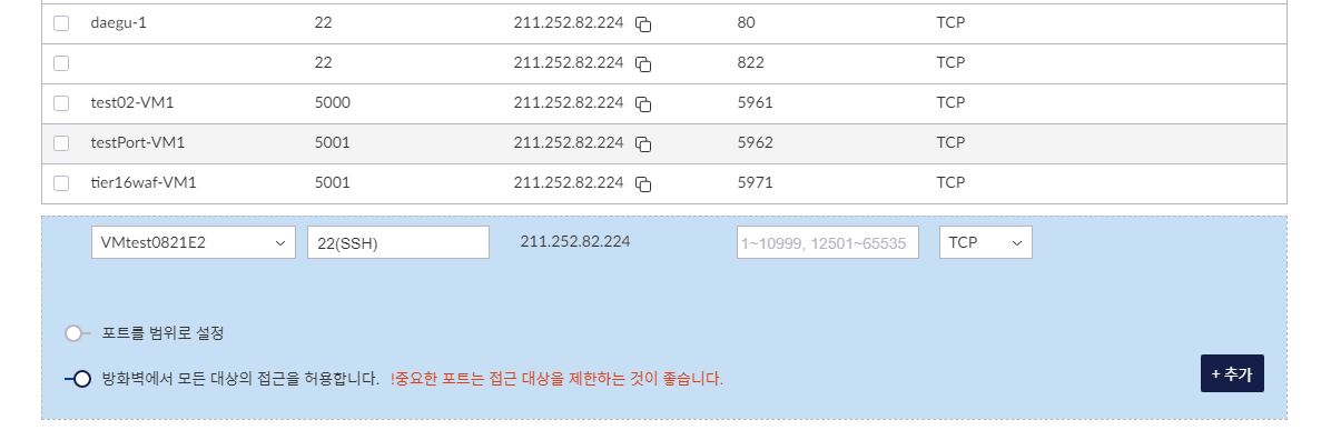 - 해당 공인IP에 맵핑되는 사설 VM 선택 및 공인/사설 포트에 대한 설정을 하여 포트포워딩을 만들 수 있습니다.