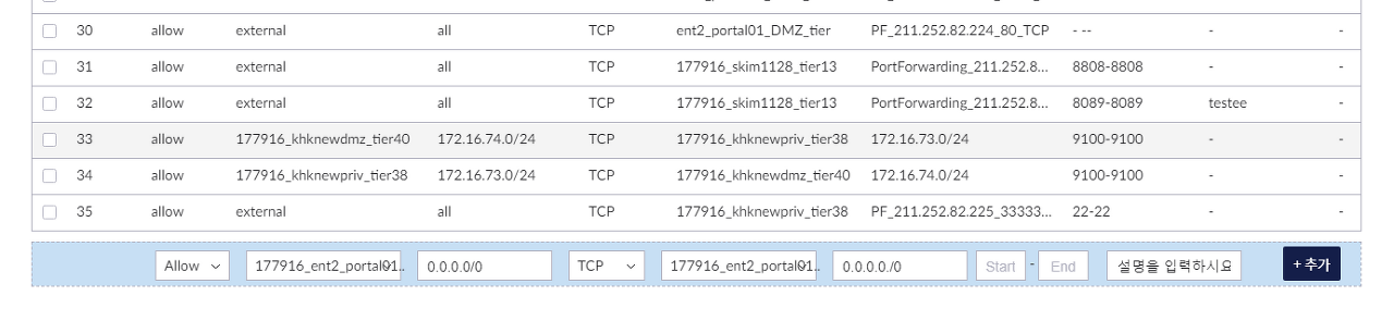 - 방화벽 화면에서, 외부->내부로의 접근을 허용하는 방화벽 정책을 생성해야 하며, 외부로부터 접속하려는 서버를 선택하고, 접속 정보를 입력합니다.
